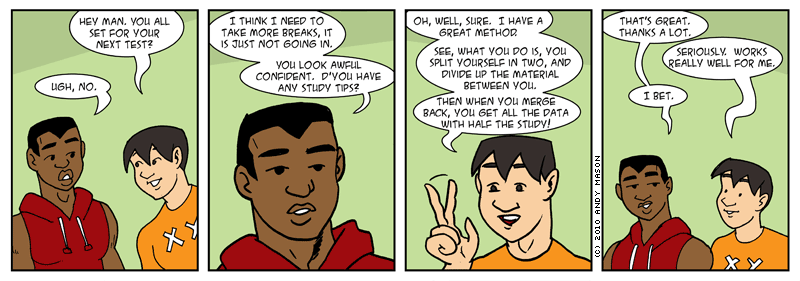 This comic just appeared in my head whole while I was thinking about what to do. If you don't recognise these guys, they're other students and you know what you should really read the archives.