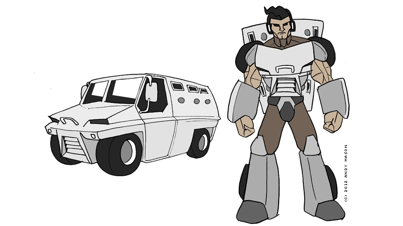 Yeah, we're kind of busy right now so expect filler for the next week or so. Here is Iain as a Transformer. He's an armoured car or something! I think he's much better than the other ones, probably using photo reference for the vehicle mode helped. And now in colour.